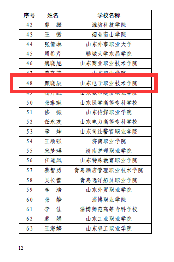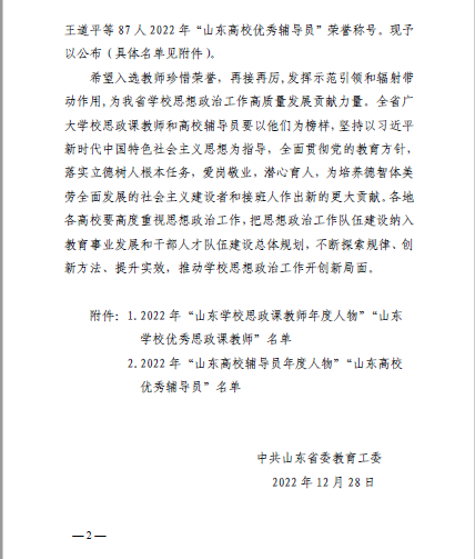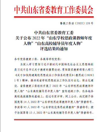 近日,《中共山东省委教育工委关于公布2022年“山东学校思政课教师年度人物”“山东高校辅导员年度人物”评选结果的通知》发布,我校商务管理系辅导员颜晓辰老师荣获“2022年山东高校优秀辅导员”。