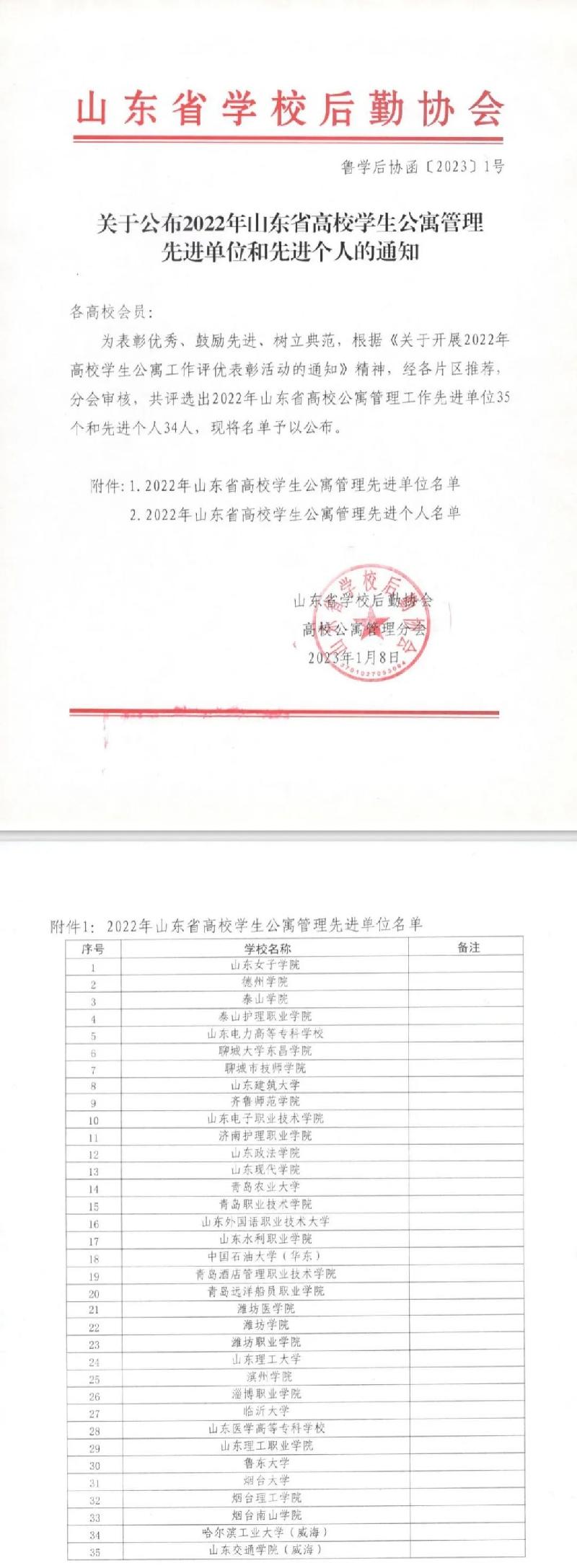 近日,2022年山东省高校学生公寓管理先进单位和先进个人名单公布,我校连续第四年获得山东省高校学生公寓管理先进单位称号。