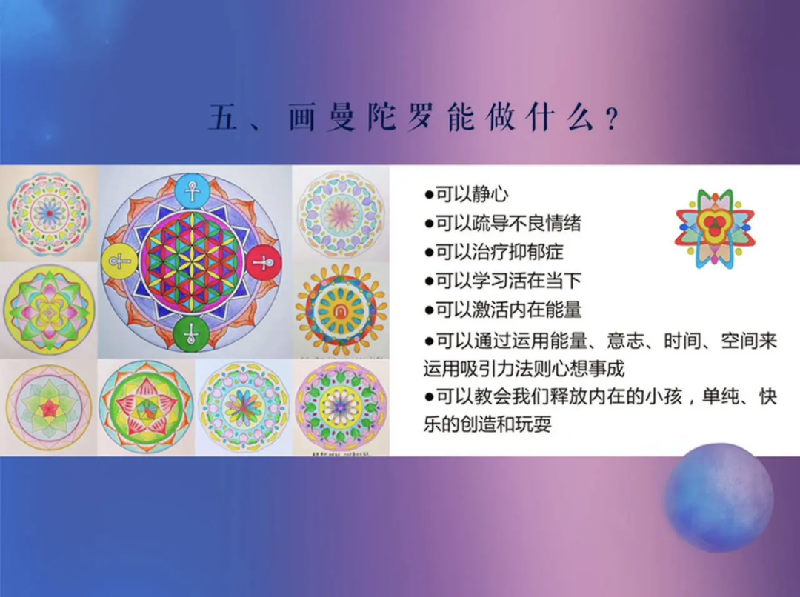 培训课程中,主讲老师从曼陀罗绘画理论学习入手,讲解了曼陀罗绘画疗法的概念、曼陀罗在自我成长中的运用、曼陀罗在咨询中的应用、曼陀罗在团体中的运用等。帮助师生了解到,曼陀罗最早是由心理学家荣格引入到心理治疗中,其原理是荣格学派的自性理论,自性具有保护性、凝聚性、整合性、咨询性和超越性的特性,通过曼陀罗绘画能够激发出绘画者的自性原型,从而获得治疗的作用,即荣格认为我们每一个人的内心都是分裂的,需要自性来整合自我实现心理平衡,而曼陀罗是能够激发自性的工具。