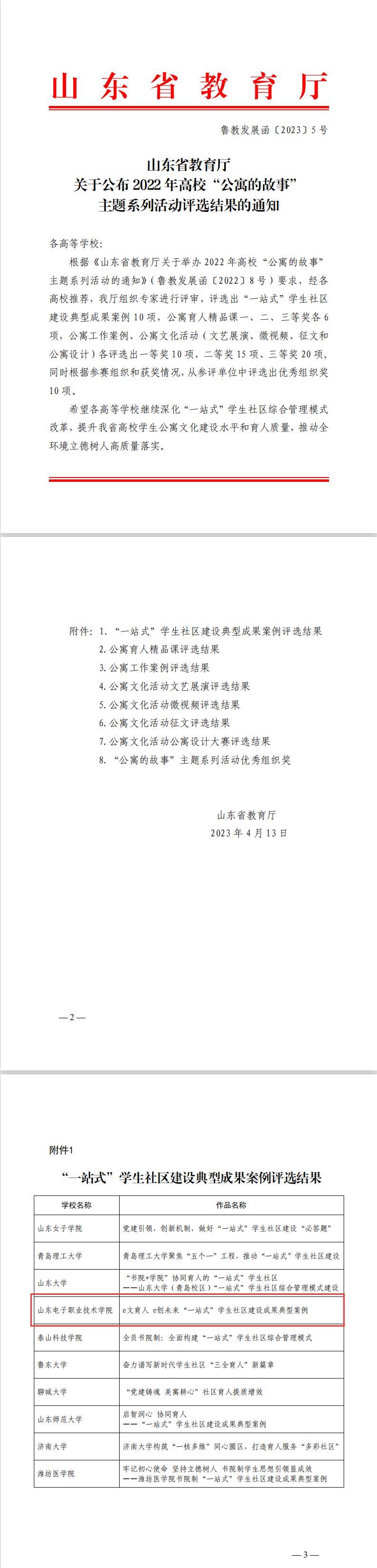 近日,山东省教育厅公布“一站式”学生社区建设典型成果案例,共评选出“一站式”学生社区建设典型成果案例10项,我校 “e”文育人 e创未来“一站式”学生社区建设成果案例成功入选。