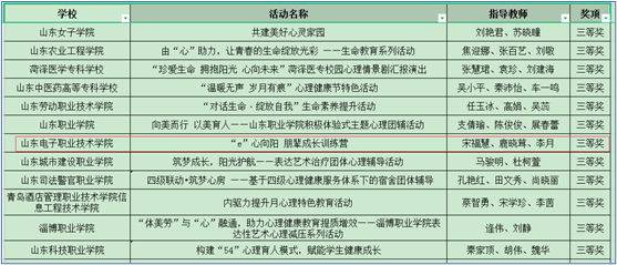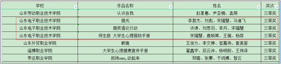 近日,山东省高等学校思想政治教育研究会大学生心理健康教育专委会公布《2023年山东省高校心理健康教育月展示活动评选结果》,我校师生在此次活动中斩获佳绩,共有8项作品获奖,其中一等奖2项,三等奖6项。