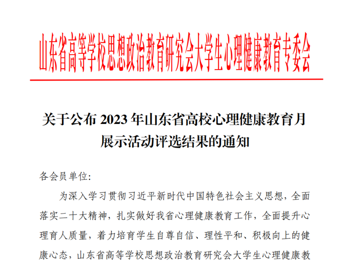 为深入学习贯彻习近平新时代中国特色社会主义思想,全面落实党的二十大精神,扎实做好心理健康教育工作,全面提升心理育人质量,着力培育学生自尊自信、理性平和、积极向上的健康心态,山东省高等学校思想政治教育研究会大学生心理健康教育专业委员会举办了2023年山东省高校心理健康教育月展示活动。