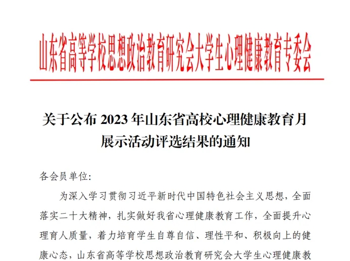 山东省高等学校思想政治教育研究会大学生心理健康教育专委会公布《2023年山东省高校心理健康月展示活动评选结果》,我校师生在此次活动中斩获佳绩,共有8项作品获奖,其中一等奖2项,三等奖6项。心理咨询中心宋福慧老师的作品《生命以痛吻我,我却报之以歌——一例边缘型人格障碍的心理辅导案例》,获得优秀心理辅导案例一等奖;J22002班刘梵同学的作品《此情深邃,以付中华》,获得“致可爱的我和你”三行诗创作大赛一等奖;我校心理健康教育月特色活动--“e心向阳·朋辈成长训练营”,获得心理健康教育特色活动三等奖;财经金融系心理辅导员李月老师的作品《一例应用积极心理干预方法化解宿舍矛盾冲突的案例》,获得优秀心理辅导案例三等奖;J21010班李君杰、C22002班许涛等制作的心理健康教育宣传片《微光》、《微笑倡议行动》,以及我校心理咨询中心编制的《师生版-大学生心理援助手册》,均获得心理健康主题宣传作品三等奖;S22008班张腾同学的作品《妈妈》,获得“致可爱的我和你”三行诗创作大赛三等奖。