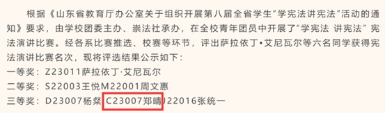 财经金融系C23007郑晴在全校青年团员“学宪法 讲宪法” 宪法演讲比赛中荣获三等奖。