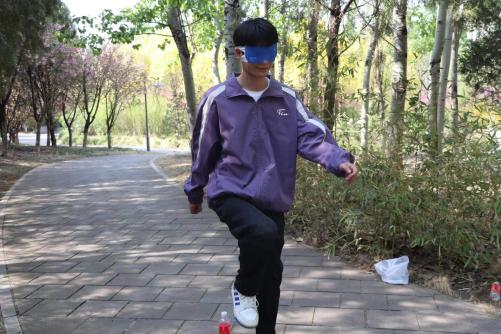 第二个环节——蒙眼原地踏步走,挑战者在规定范围内蒙眼原地踏步走,规定时间内不走出范围即为获胜,通过这个游戏,提高了同学们的专注力,锻炼了同学们的平衡感知能力,培养了同学们积极挑战的勇气。