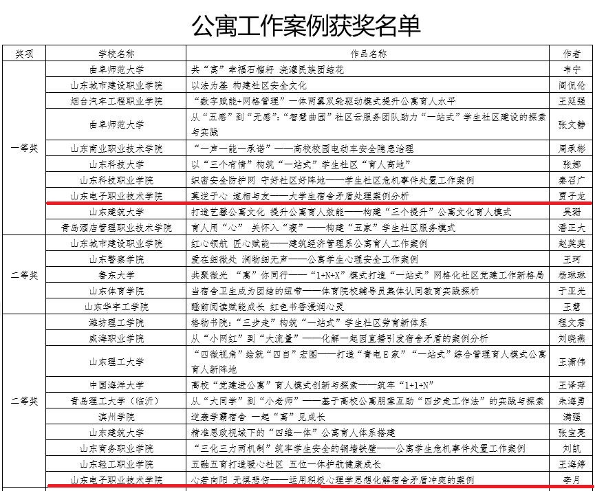 近日,山东省教育厅对2023年山东省高校“公寓的故事”主题系列活动获奖结果进行公示,商务管理系辅导员贾子龙的工作案例《莫逆于心 遂相与友——大学生宿舍矛盾处理案例分析》荣获公寓工作案例等奖,财经金融系辅导员李月的工作案例《心若向阳 无惧悲伤——运用积极心理学思想化解宿舍矛盾冲突的案例荣获公寓工作案例等奖