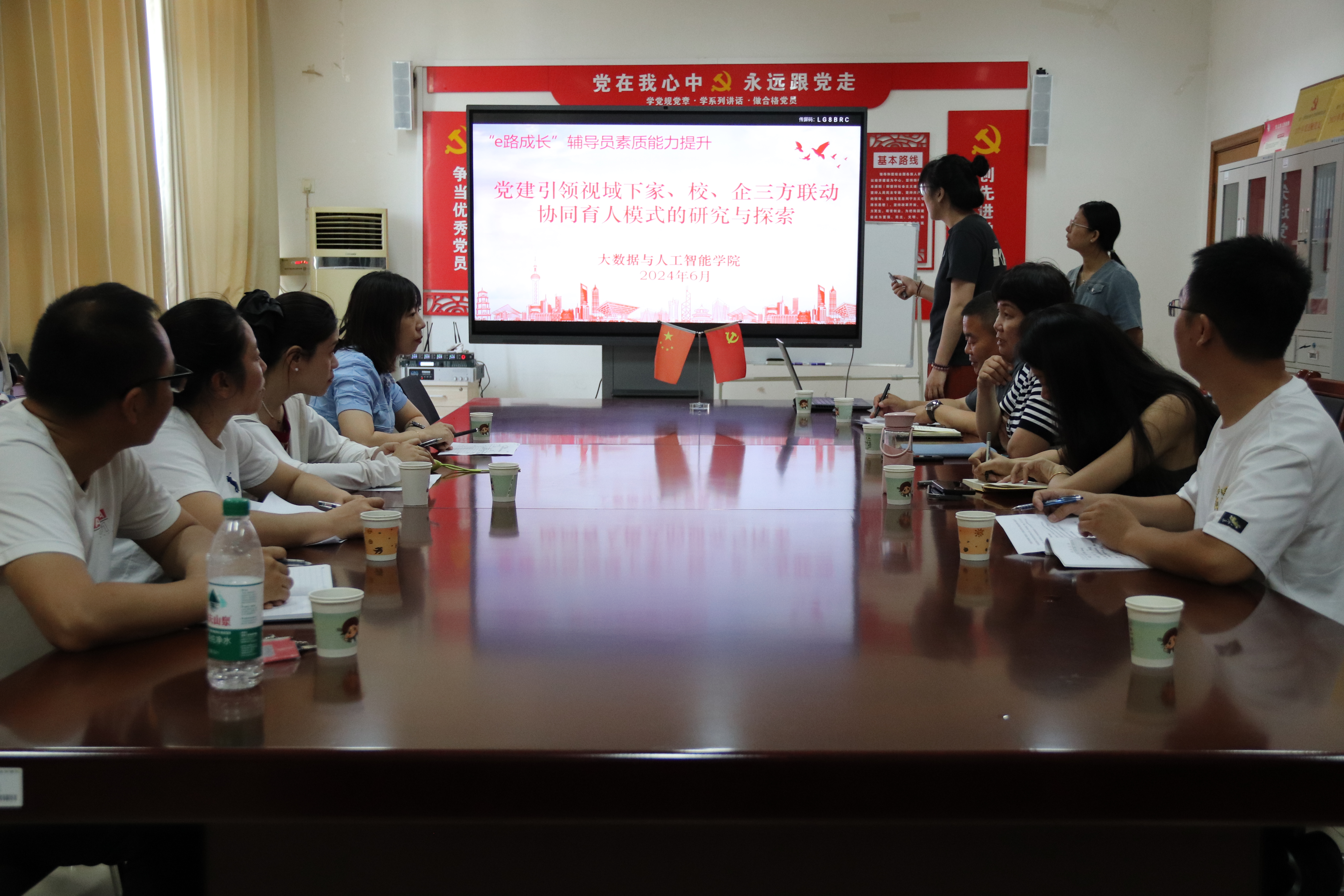大数据与人工智能学院组织召开以“党建引领视域下家、校、企三方联动 协同育人模式的研究与探索”为主题的辅导员沙龙。李海彬科长介绍大数据与人工智能学院在党建引领视域下家、校、企三方联动,协同育人模式中的特色做法,分享了本学院与企业合作的成功案例,如共建实习实训基地、开展产学研项目等,生动展现了理论与实践相结合在提升学生实践能力和就业竞争力上的成效。