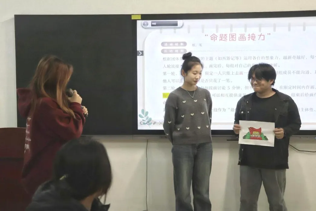 同学们自行分成若干组,在组长的带领下,通过共同制定组规、组名等,提高了同学们积极参与团队建设的意识;在“命题图画接力活动”中,同学们感受到优秀团体的建设离不开共同的合作以及真诚的投入;在最后的交流讨论环节,每个同学用一句话表达感受,团队的氛围在大家的真挚发言中变得格外温馨。