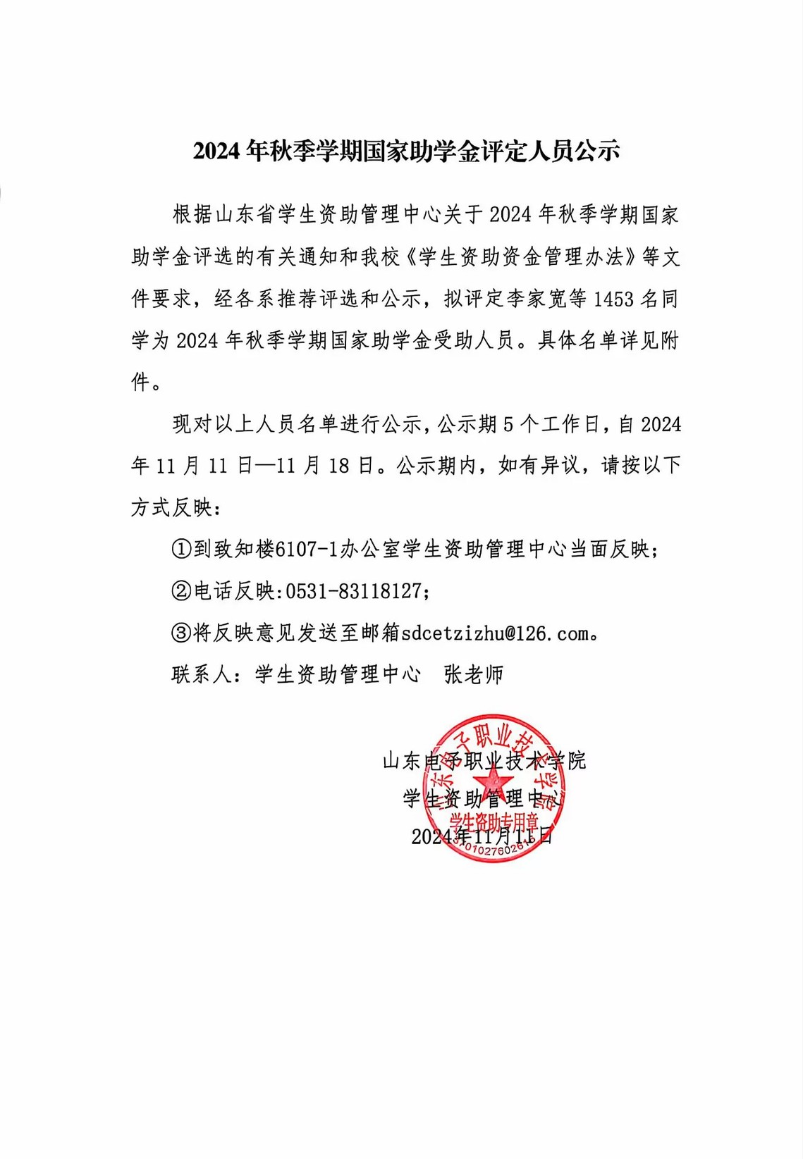 2024年秋季学期国家助学金评定人员公示