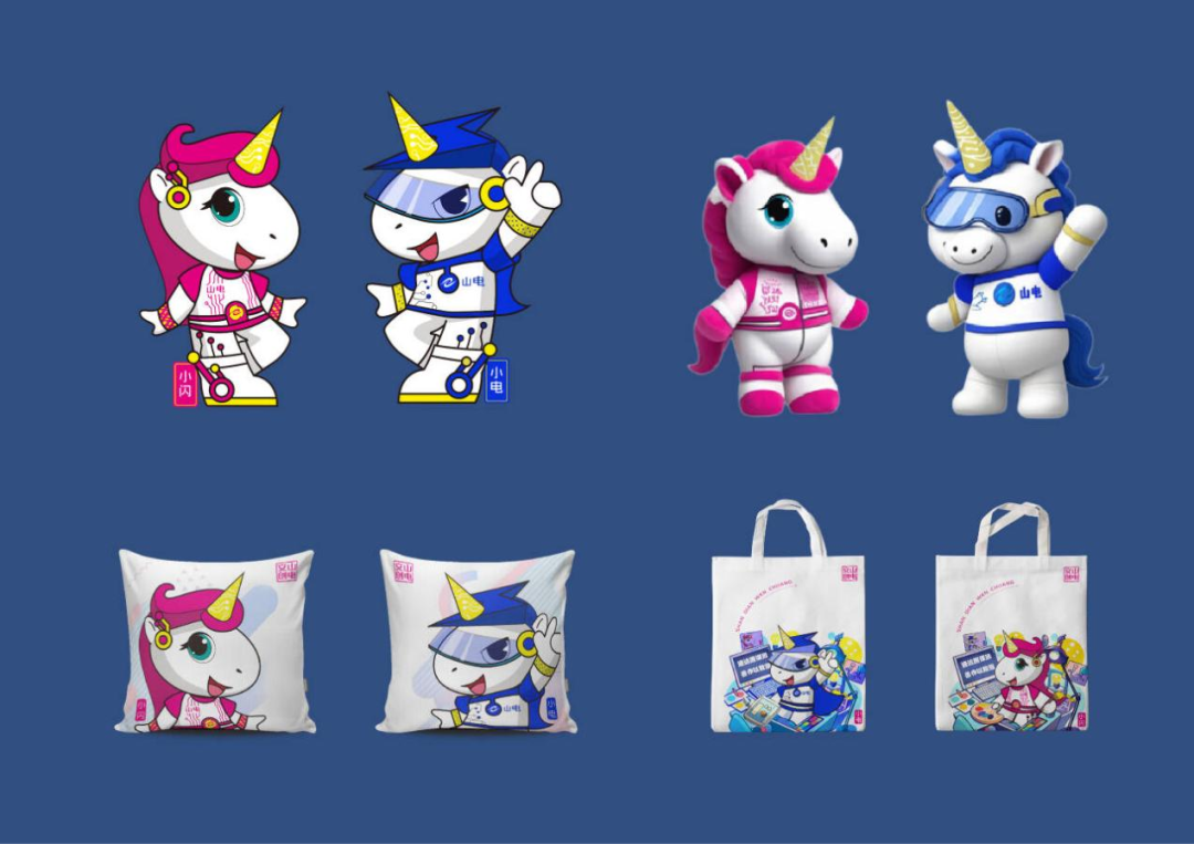 同时,在数字媒体系王一如院长的支持与统筹下,积极调动浩鲸云计算科技股份有限公司、济南市新艺慧数字科技有限公司等校企合作企业,提供AI技术支持,赋予文创产品智能化。项目团队成员参与,积极联系加工制作机构,打造出钥匙扣、手提兜、气球、靠枕等系列文创衍生产品,“小闪”和“小电”的可爱形象走进了广大师生和校友们的日常学习与生活中。