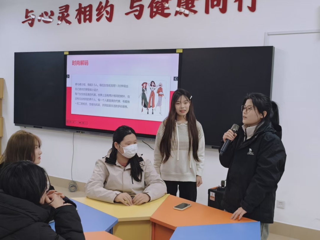 在舒缓的音乐中,进行了热身活动“时尚解码”,通过分享个人的时尚穿搭,拉进了同学们之间的距离,帮助同学们放松身心。