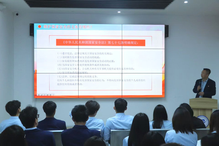 活动中,学生工作处李友老师以“新时代大学生与国家安全”为主题展开专题讲解。他系统阐释了国家安全的丰富内涵与涵盖的16个重点领域,深入解读总体国家安全观的“十个坚持”,并借助近年来高校学生群体中发生的真实案例,生动剖析境外势力渗透、网络数据窃取、军事装备泄密等危害国家安全行为的隐蔽性。李友老师特别强调,当代大学生应主动提升政治敏感性和安全防范意识,在涉外交流、网络社交、日常生活等场景中严守底线,做到“警惕风险、明辨是非、理性发声”,将维护国家安全融入日常生活的点滴行动。