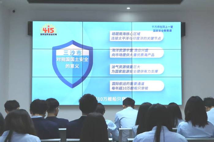 专题讲解结束后,全体人员共同观看由教育部指导推出的《千万师生同上一堂国家安全教育课》。课程邀请中国南海研究院王胜教授、山东大学马克思主义学院(威海)郝书翠教授、北京邮电大学网络空间安全学院付俊松副教授联合讲授,聚焦当前国际形势下的国家安全挑战,从海洋权益维护、意识形态安全、网络空间治理等维度展开深度分析。课程通过真实影像资料与互动问答形式,强调高校师生在维护国家安全中的特殊使命,号召青年群体以“居安思危”的忧患意识和“躬身力行”的担当精神,争做国家安全的“宣传者”和“守护者”。