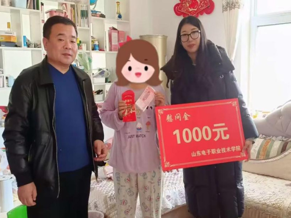 李海彬科长带领辅导员李荣辉、杨晓慧老师首先来到章丘区一位家庭经济困难学生的临时住所。他们仔细询问了学生的住宿情况,并对居住环境进行了全面细致的安全检查,确保学生居住安全无忧。在交流过程中,老师们鼓励学生珍惜时间、勤奋学习,努力提升自己,并代表学校为学生送上了慰问金,这份慰问金承载着学校对学生的深切关怀与殷切期望 。