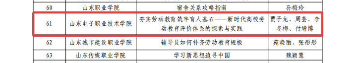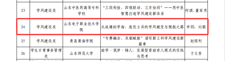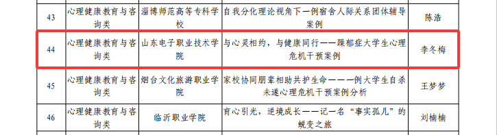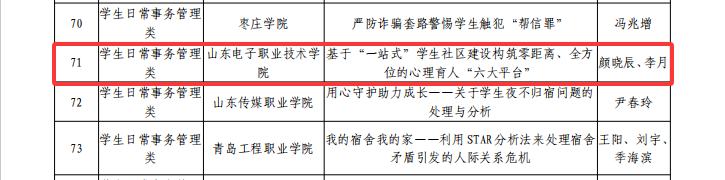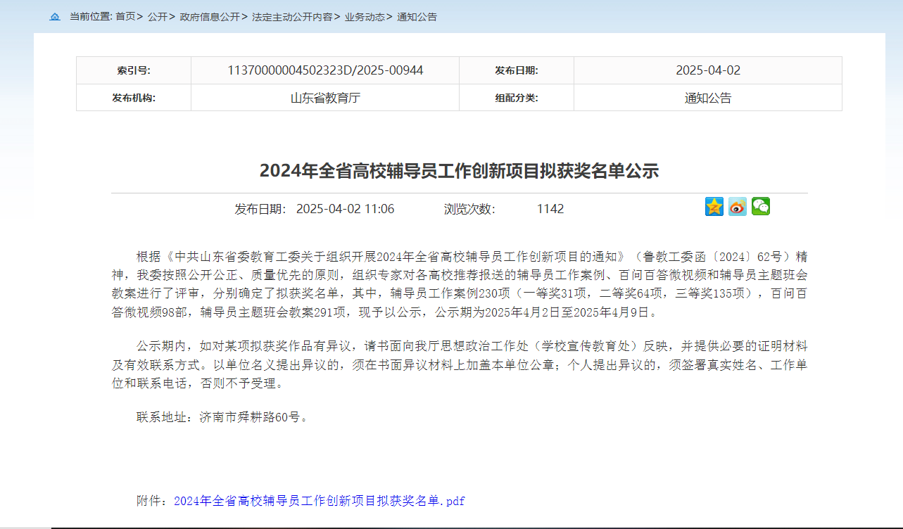 近日,在山东省教育厅(省委教育工委)发布的《2024年全省高校辅导员工作创新项目拟获奖名单公示》中,我校5项作品获奖,其中辅导员工作优秀案例二等奖2项、 三等奖1项,优秀百问百答微视频1项,辅导员主题班会个人作品优秀教案1项。