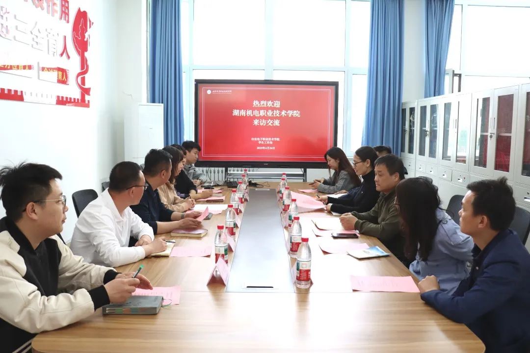 4月24日下午,湖南机电职业技术学院学生工作部部长胡金枚一行来我校交流,两校围绕学生工作信息化建设开展座谈。我校学生工作处处长王佩及相关科室负责人、辅导员代表、“e智学工”系统供应商代表参加此次交流。