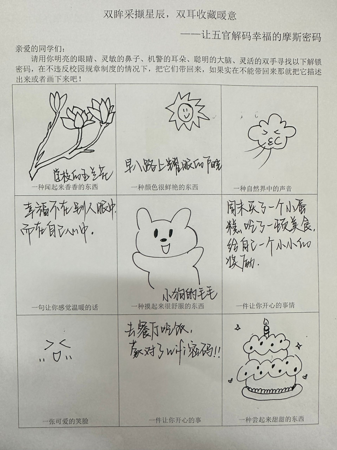 与此同时,学院启动“五感解码计划”,引导学生通过视觉、听觉、嗅觉、味觉、触觉去感受生活中的点滴幸福。学生们积极参与,用细腻的笔触和生动的影像记录下生活中的美好瞬间,重新发现平凡日子里的珍贵与温暖。