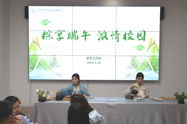 活动现场,党员教师与中心学生干部身影交织,老师们亲手将饱含祝福的卡片系上许愿树,如播撒春日种子,祈愿关怀在学子心中生根;香甜的粽子和琳琅美食铺满桌面,师生围坐,共享清茶与甜粽,亲切交谈间拉近心距,笑语盈盈中情谊流淌。活动特邀茶艺社同学现场展示茶艺,她们身着素雅茶服,从容演绎烫杯、注水、冲泡、分茶的雅艺,茶香氤氲,吸引师生驻足沉浸,传统韵味在杯盏间无声传递。