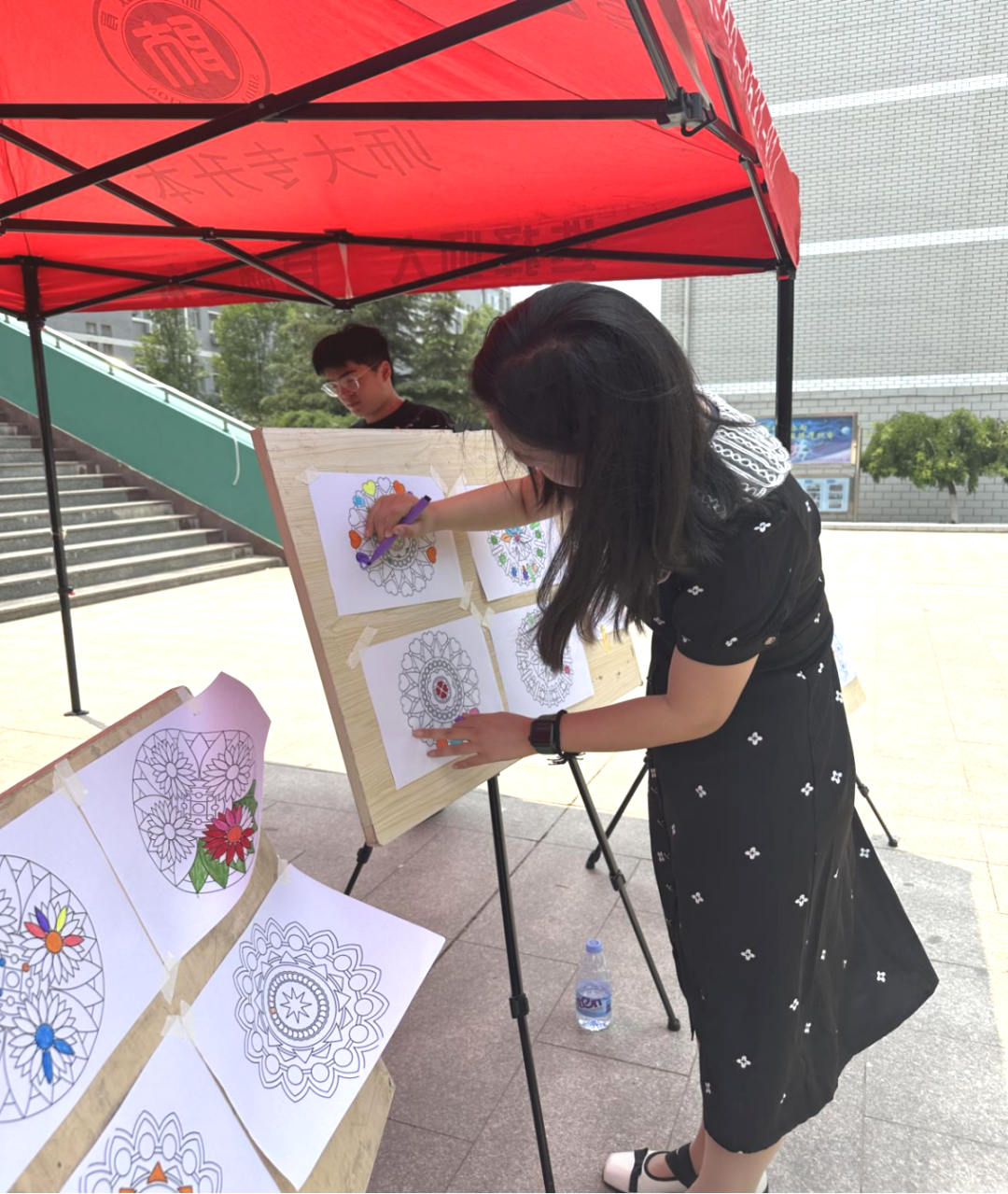 “曼陀罗绘画”区域则充满了艺术与宁静的气息。心理健康教育服务部的干事们,向同学们介绍曼陀罗绘画的文化内涵与创作技巧。大家手持画笔,在画纸上勾勒出繁复精美的图案,将内心的情绪与创意融入色彩与线条之中。在创作过程里,同学们不仅完成了一幅幅独特的手绘作品,还在专注绘画的过程中舒缓了压力,感受到艺术疗愈的神奇力量。