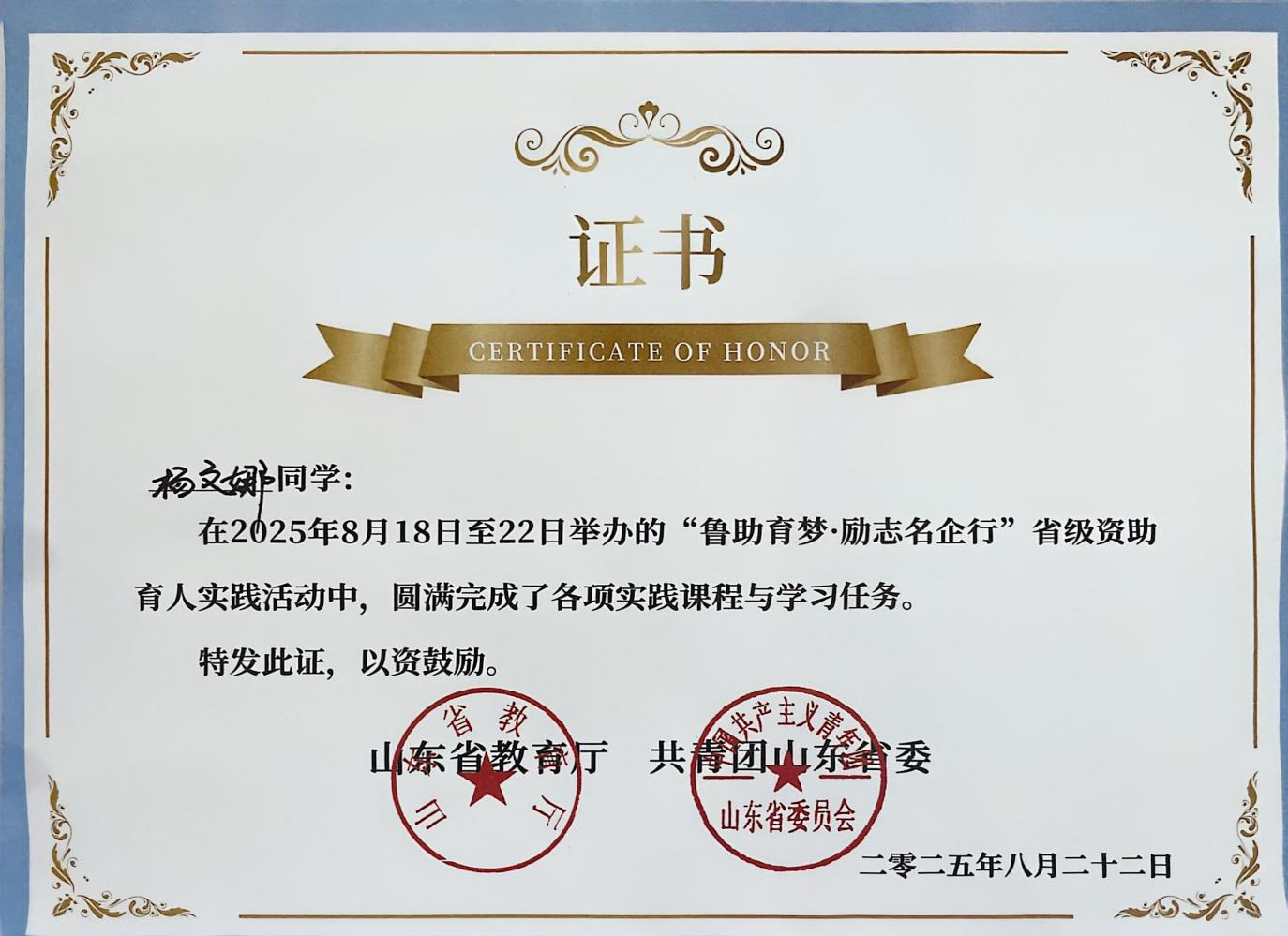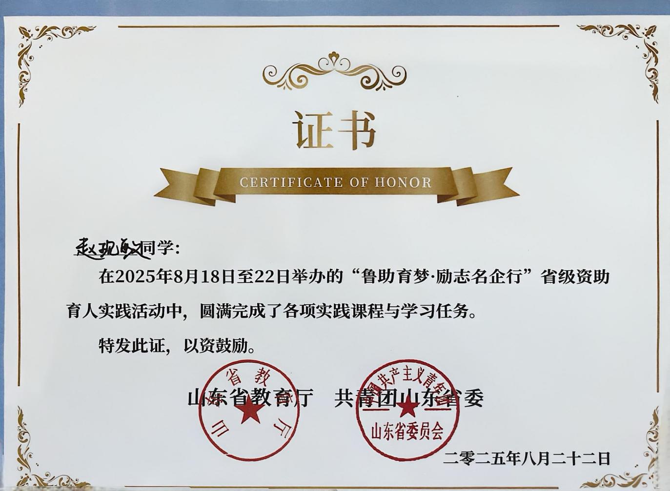 8月18日至8月22日,由山东省教育厅、团省委联合发起的2025年“鲁助育梦·励志名企行”省级资助育人实践活动在历经5天的精彩行程后圆满落幕。全省高校近200名学生代表共同参与,我校选派杨文娜、赵现敏两名优秀学生代表全程参与,圆满完成各项实践学习任务。