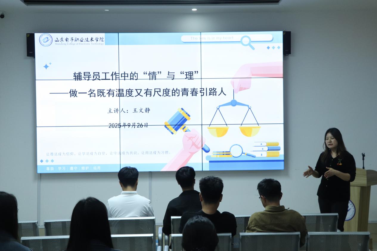 学生工作处副处长王文静作“辅导员工作中的‘情’与‘理’——做一名既有温度又有尺度的青春引路人”专题辅导。她结合校园真实案例,深刻阐述了在应对校园危机事件时应具备的五种法治思维:规则思维、权利与义务思维、程序思维、控权思维和权利保障思维,引导新入职辅导员在履职中将“情”与“理”相融合,真正做到让尊法成为信仰、学法成为自觉、守法成为共识、用法成为习惯。