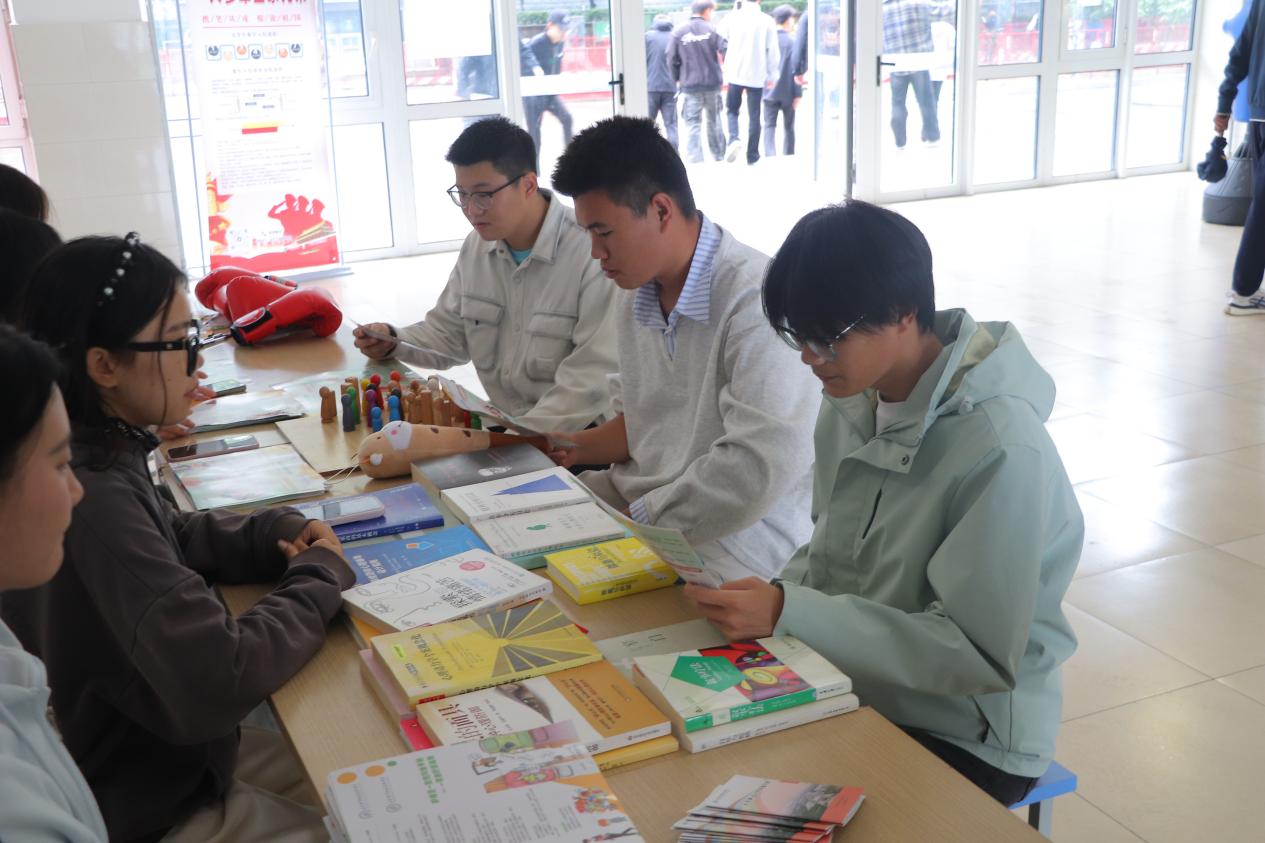 在心理健康知识展区,通过展示心理健康相关书籍和主题展板、发放精美手册等多种形式,向学生们系统科普心理健康知识。展区内的书籍涵盖了情绪管理、压力调节等多个领域,手册则以通俗易懂的语言和生动形象的案例,介绍了常见心理问题的识别方法与应对技巧,展板上的图文内容更是清晰直观地呈现了心理健康的重要性以及保持心理健康的实用方法。不少学生驻足展区,认真翻阅书籍、阅读手册,不时与身边同学交流感悟,在轻松的氛围中学习心理健康知识,提升自我心理调适能力。