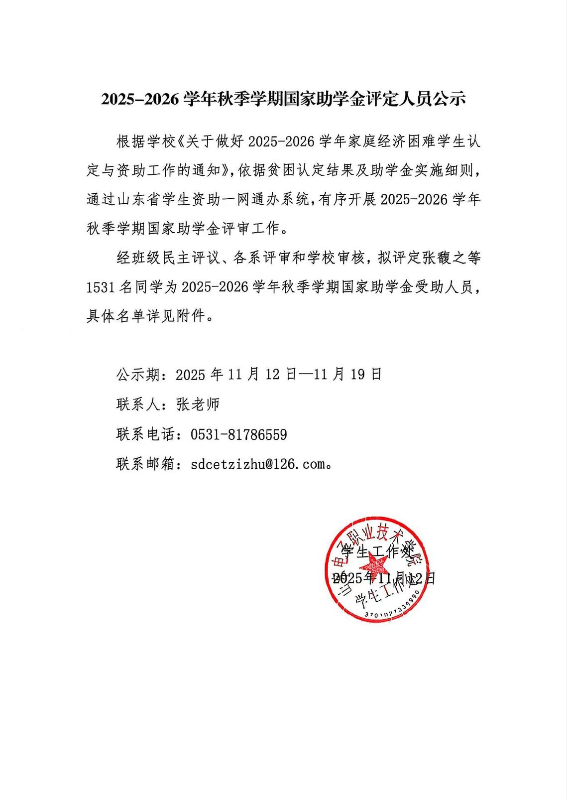 2025-2026学年秋季学期国家助学金评定人员公示