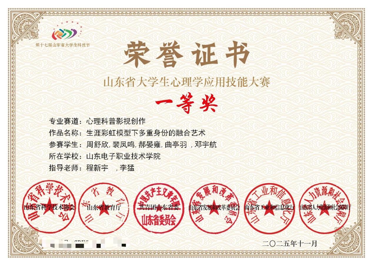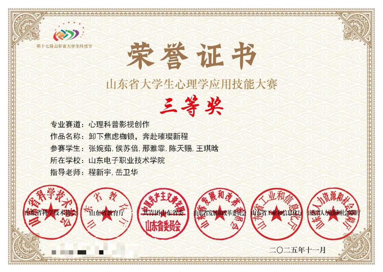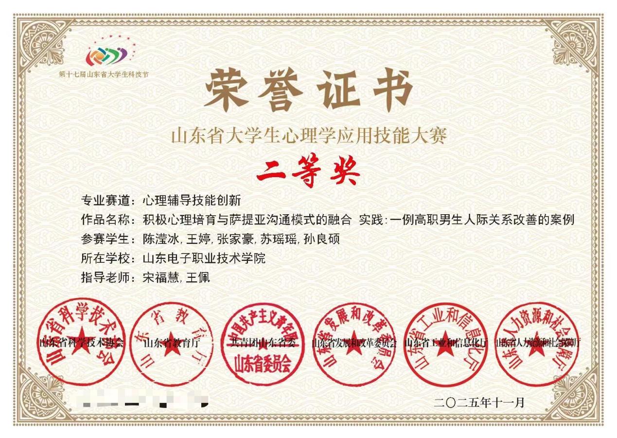 近日,由山东省科学技术协会、山东省教育厅、共青团山东省委员会等6个部门联合主办的“第十七届山东省大学生科技节——山东省大学生心理学应用技能大赛决赛”在山东第二医科大学(浮烟山校区)举行。我校队伍在宋福慧、李月、程新宇等老师的指导下在本次比赛中获奖5项,其中,一等奖1项,二等奖1项,三等奖3项。