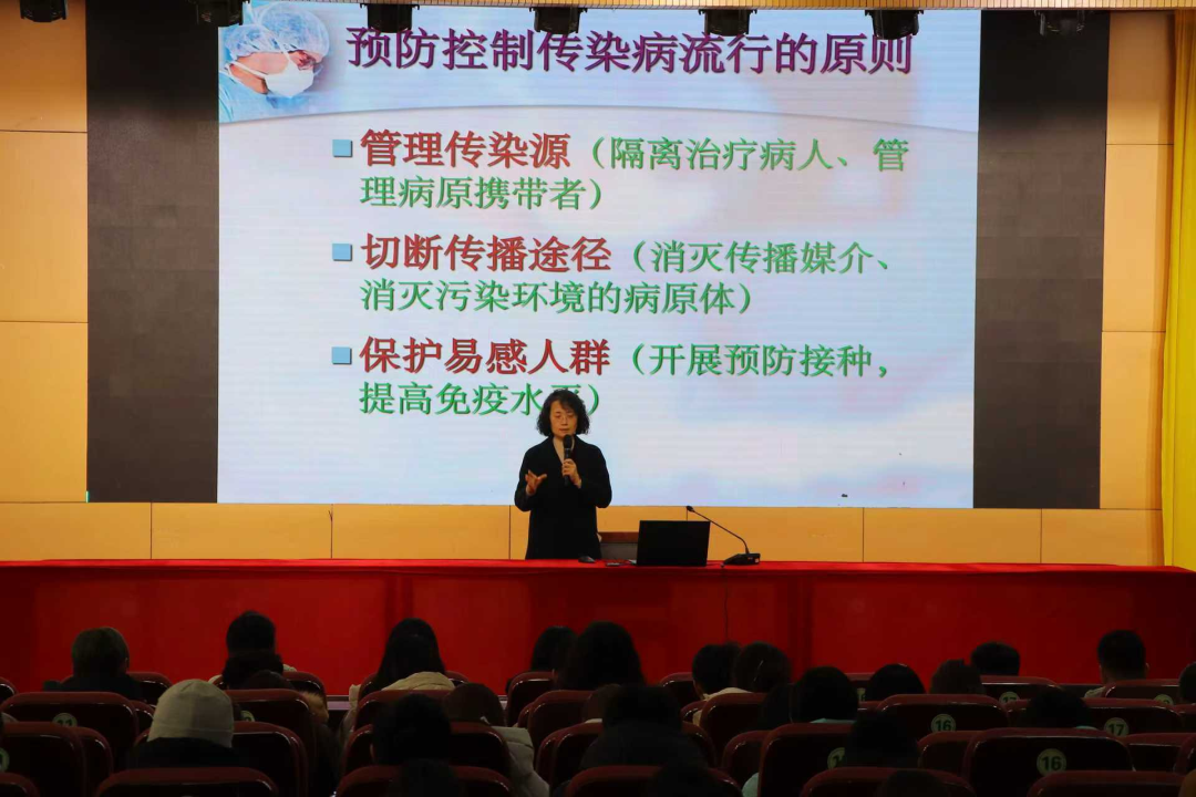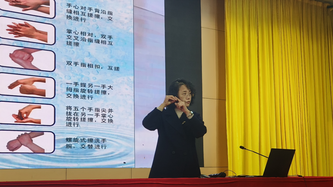 魏红主任以“秋冬季传染病与健康教育”为题,围绕流感与普通感冒的区别、甲流及腮腺炎等校园常见传染病预防、日常卫生习惯养成等方面作了系统讲解,现场示范七步洗手法,教育引导师生增强自我防护意识,提高校园传染病防控能力。