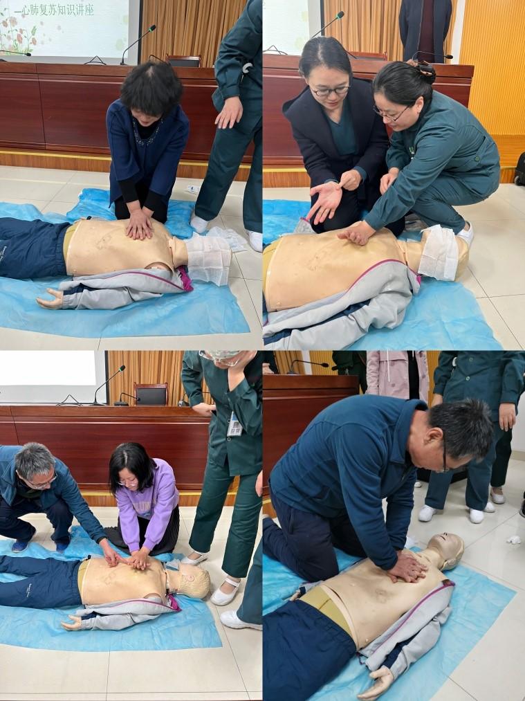 讲座分为理论讲授、现场演示及实践操作三部分内容。王青通过题目讲解、实物展示、现场演示等形式,为老师们详细讲述急救相关的理论知识,结合近年来发生在身边的案例,向老师们强调了应急救护“黄金四分钟”的重要性。并逐一讲解胸外按压、人工呼吸、海姆立克急救法等抢救操作方法,全面展示了心肺复苏和气道异物梗塞突发事故的现场救助流程。
