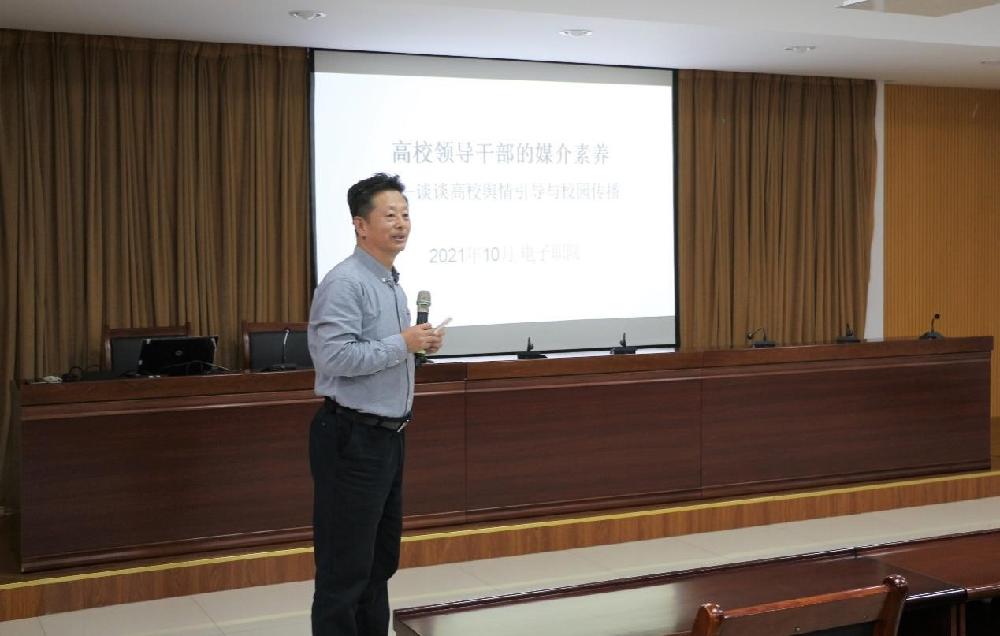 10月29日,学校在行政办公楼222会议室开展高校舆情引导与校园传播专题培训。山东省教育厅(省委教育工委)新闻中心主任,研究员宋全政应邀作辅导报告。党委副书记迟会礼出席并主持会议,各系部、各部门负责人及全体信息员、网评员参加会议。