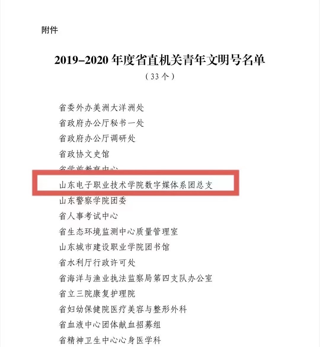 按照《山东省青年文明号管理办法》,经严格考核,山东省省直机关团工委新认定我校数字媒体系团总支 “2019—2020年度山东省直机关青年文明号”荣誉称号。