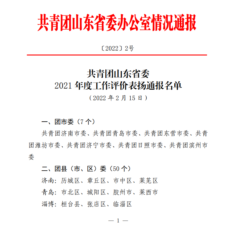 2月15日,共青团山东省委公布《2021年度工作评价表扬名单》,我校团委荣列其中。