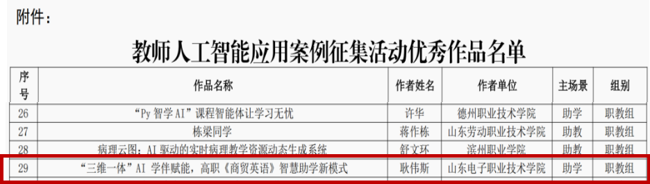 近日,山东省电化教育馆公布“教师人工智能应用案例征集活动优秀作品”名单。我校商务管理系耿伟斯老师提交的案例《“三维一体”AI学伴赋能高职〈商贸英语〉智慧助学新模式》成功入选,获评优秀作品。