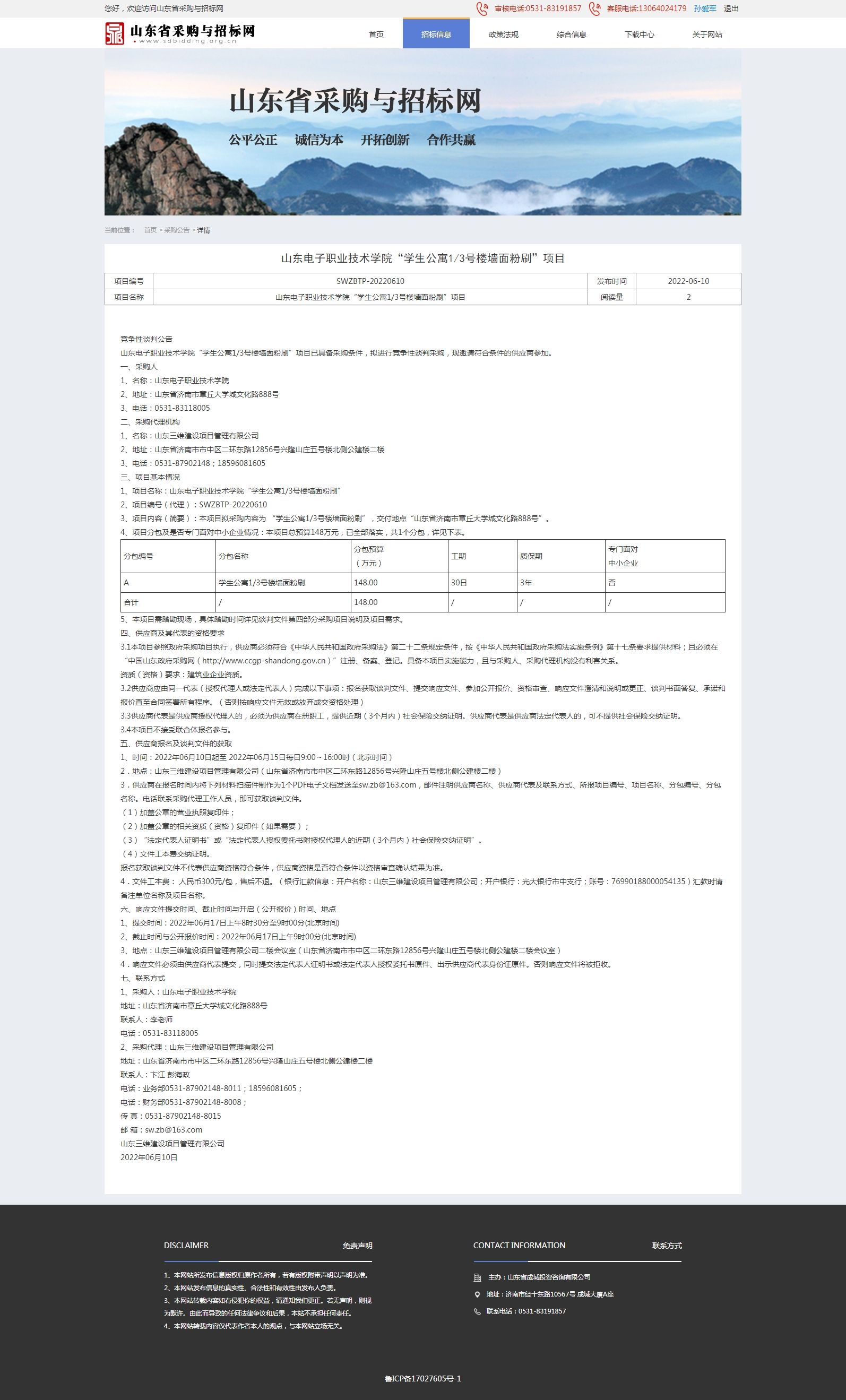 山东电子职业技术学院“学生公寓1/3号楼墙面粉刷”项目已经学校批准,具备采购条件,并委托山东三维建设项目管理有限公司组织竞争性谈判采购,详见:采购公告详情页-山东省采购与招标网 (sdbidding.org.cn)
