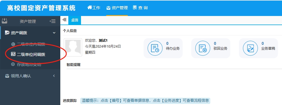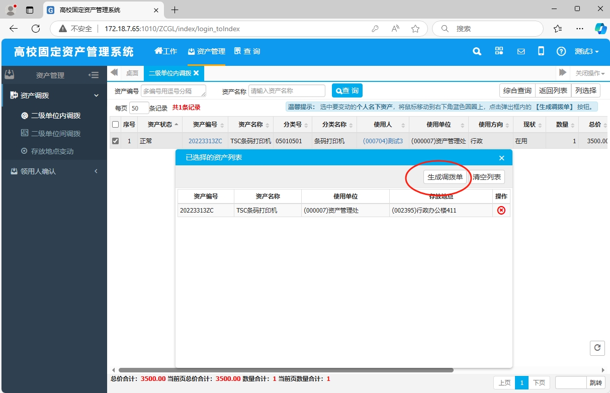 (1)“资产管理”——“资产调拨”——“二级单位内调拨”——“单位内调拨申请”——“确定”