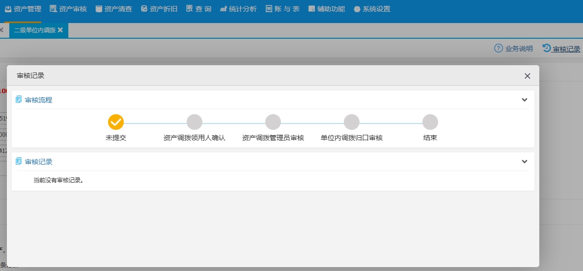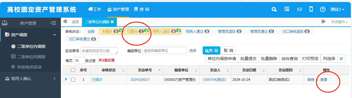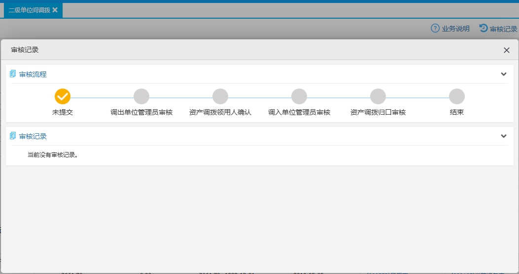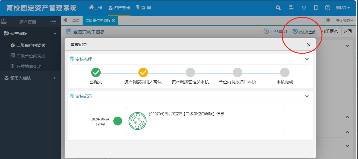 (3)填写变动后信息(需添加资产的点击“添加资产”)——“保存”——“提交(查看进度)。提交后,可以在“已提交”信息中查看调拨单详情,并点击“审核记录”查看系统内业务进度。