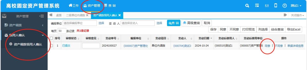 “资产管理”——“领用人确认”——“同意”