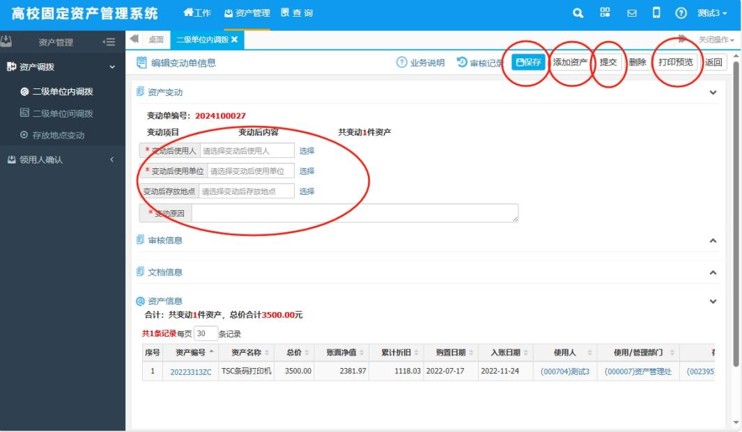 “资产管理”——“资产调拨”——“二级单位间调拨”——“单位间调拨申请”——勾选需要调拨的资产——“生成调拨单”——“添加资产”(可以添加勾选环节漏选的资产)——填写“变动后使用人、变动后使用单位、变动后存放地点、变动原因”——“保存”——“提交”——打印《资产调拨单》,完成签字盖章手续后交资产管理处。