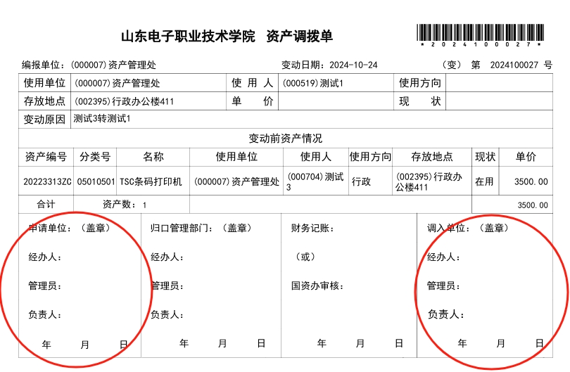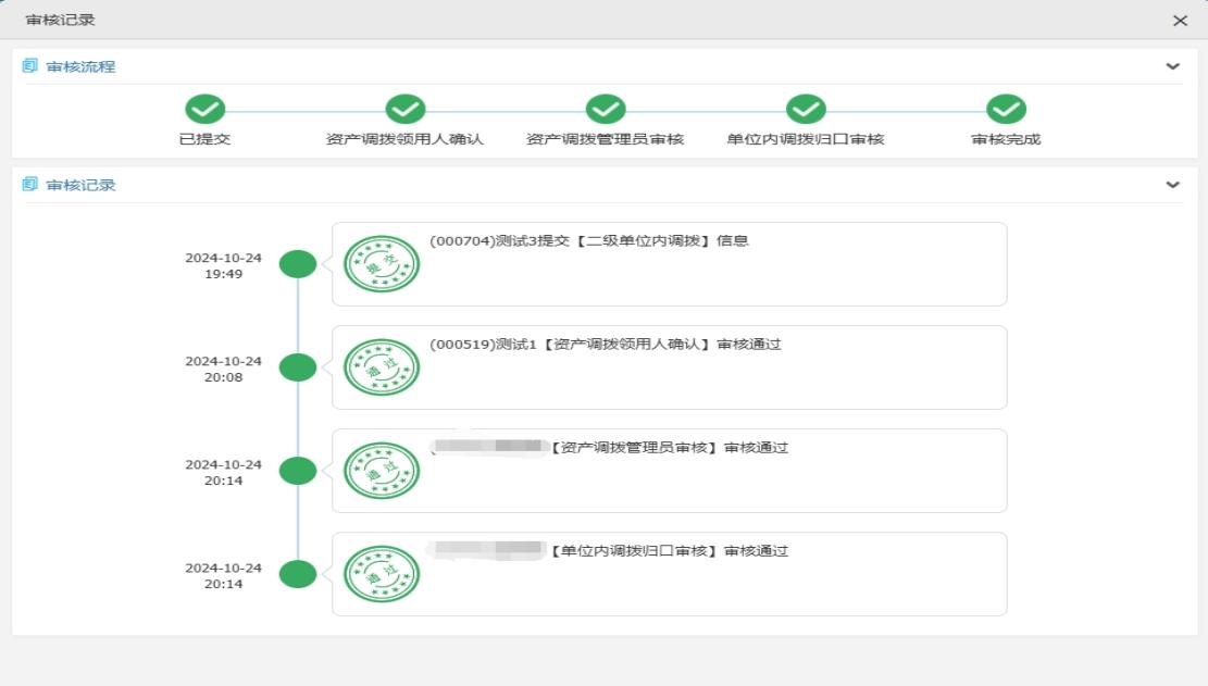 资产管理处依据转出人提交的纸质《资产调拨单》进行归口审核审核,审核完成后,即完成变更。