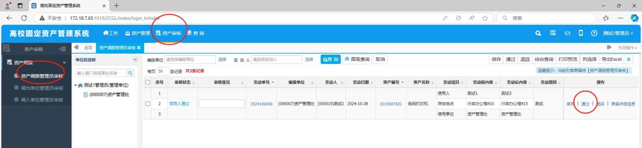 “资产审核”——“资产调拨”——“资产调拨管理员审核”——“通过”