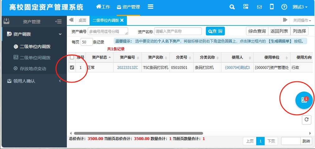 (2)勾选需要调拨的资产——鼠标放到右下角蓝色圆圈处——“生成调拨单”