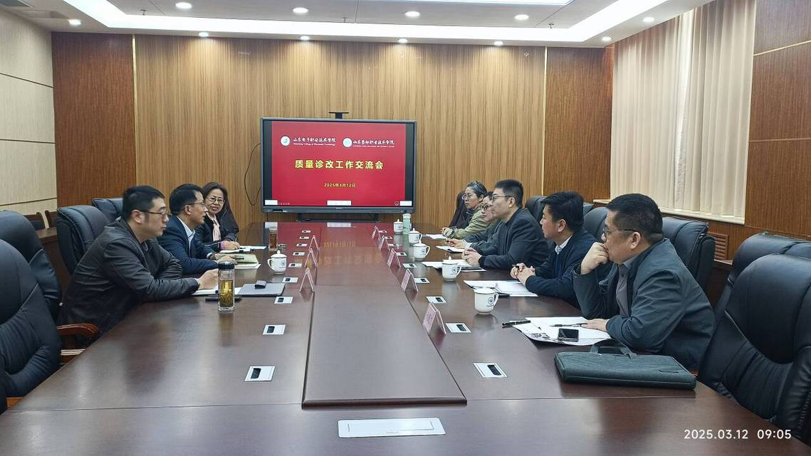 3月12日,山东电子职业技术学院副院长王毅东、质量管理处、组织人事处一行5人赴山东劳动职业技术学院,交流质量诊改工作经验。山东劳动职业技术学院副院长王毅、质量考核评估中心主任王华莲、副主任丁宁参加会议。