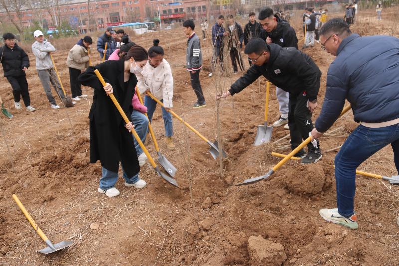 活动中,系副主任王红、系党总支副书记岳卫华及老师们与同学们一起铲土、植树,大家干劲十足,分工明确、各个环节井然有序,师生们一起挥锹铲土、扶苗培土、踩实踏平,携手立起了株株新苗,共同种下了份份希望。在大家齐心协力下,一颗颗充满生机和希望的树苗被植入泥土中,新栽种的苗木在沟壑间构成了一道靓丽风景线。