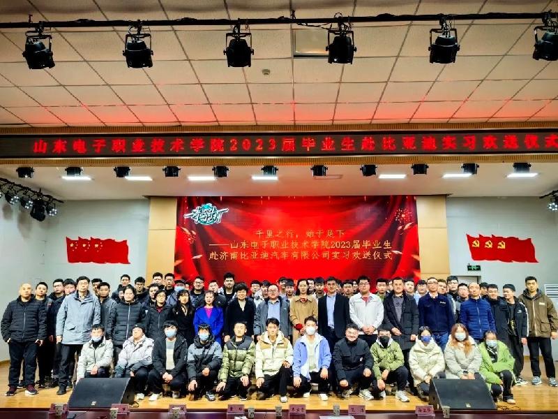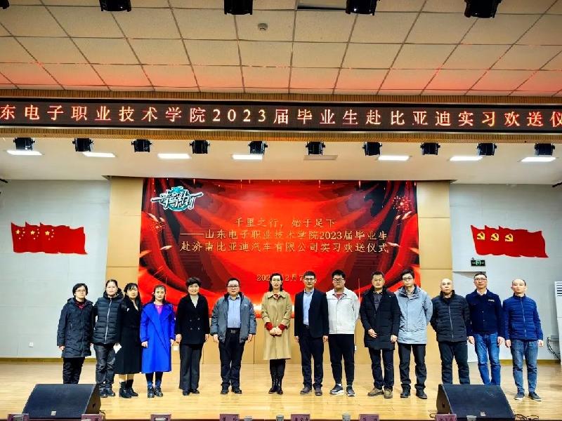 2月7日下午,学校送2023届智能制造类毕业生赴济南比亚迪汽车有限公司参加岗位实习,欢送仪式在学术报告厅举行。共青团济南市委、比亚迪公司人事部领导,学校教务处、团委有关负责人出席,智能制造工程系干部、实习指导教师及全体实习学生参加了仪式。