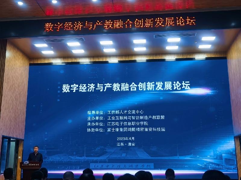 4月6日至7日,工业互联网与智能制造产教联盟一届二次会议暨数字经济与产教融合创新发展论坛在江苏电子信息职业学院举行,工信部人才交流中心副主任色云峰、江苏省工信厅领导出席活动。我校作为副理事长单位参加会议,党委副书记迟会礼受邀主持数字经济与产教融合创新发展论坛。