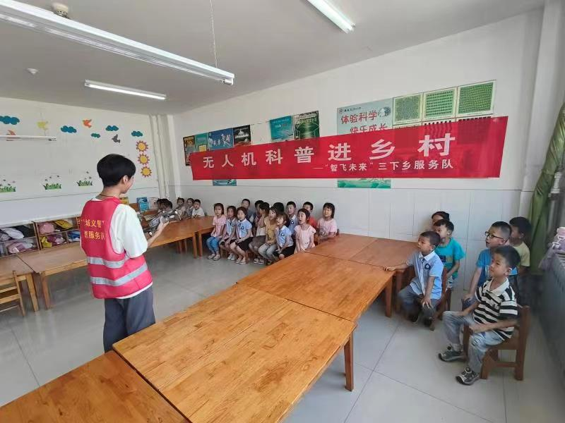 服务队成员姚翰同学为小朋友们科普无人机的实际用途、运行原理、内部结构,为小朋友们演示无人机飞行,并且在保证安全的前提下有序组织同学们实操无人机。