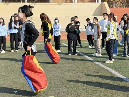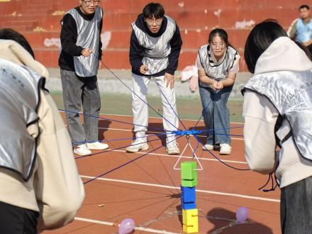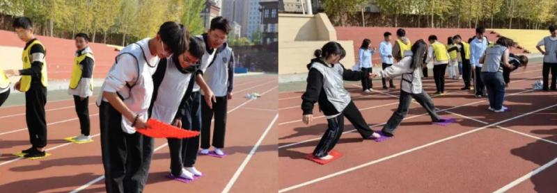 大家步步紧追,不甘落后,他们脚踩“魔毯”,欢快的笑声响彻操场。距离虽短,却体现出了同学们的团结一心。