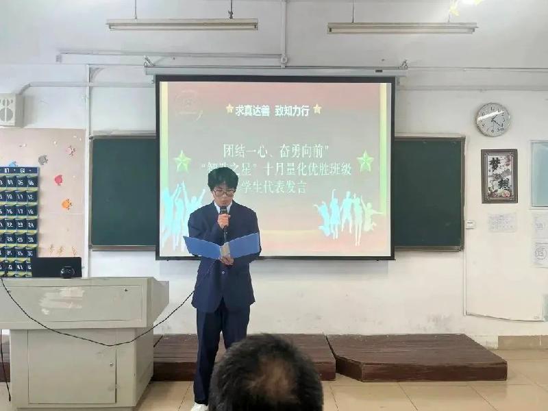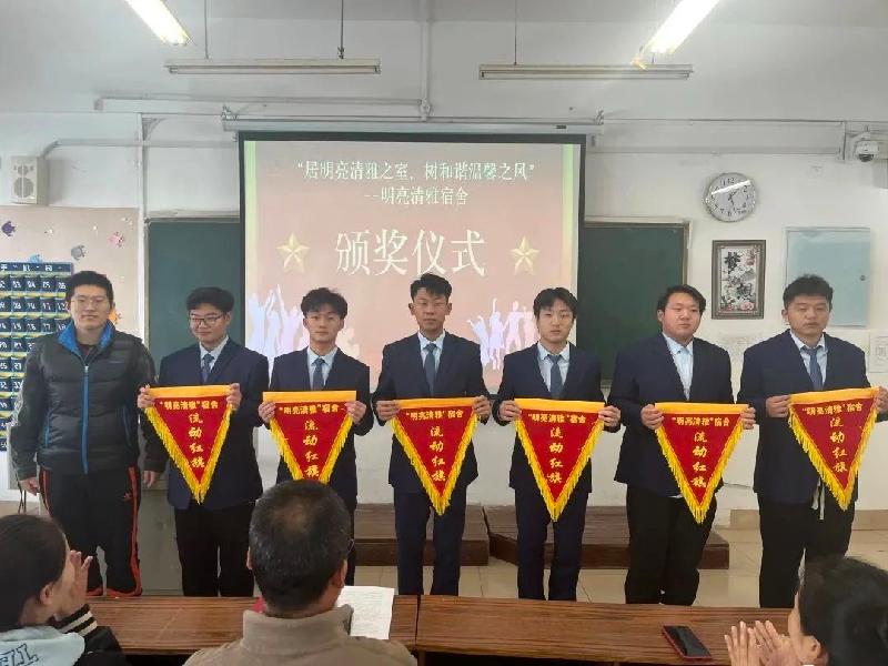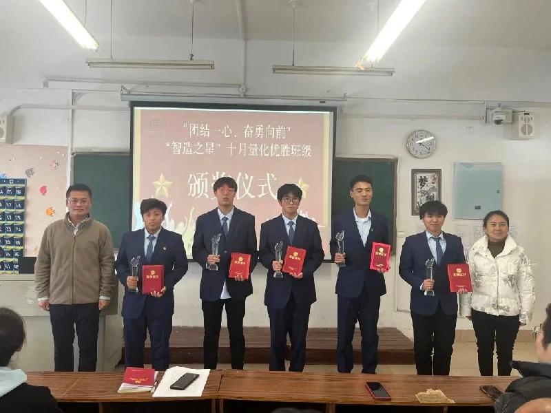 随后系党总支副书记岳卫华、辅导员宋艳文为获得“智造之星”十月量化优胜班级荣誉的Z22001、Z22005、Z23008、Z23007、Z23003五个优胜班级颁发奖杯、奖状,辅导员赵伟照为获得“明亮清雅”宿舍的4411、4338、4442、4114、4223、4230六个宿舍颁发流动红旗。优胜班级、优秀宿舍代表相继发言,分别介绍了建设良好班集体和明亮清雅宿舍的经验。