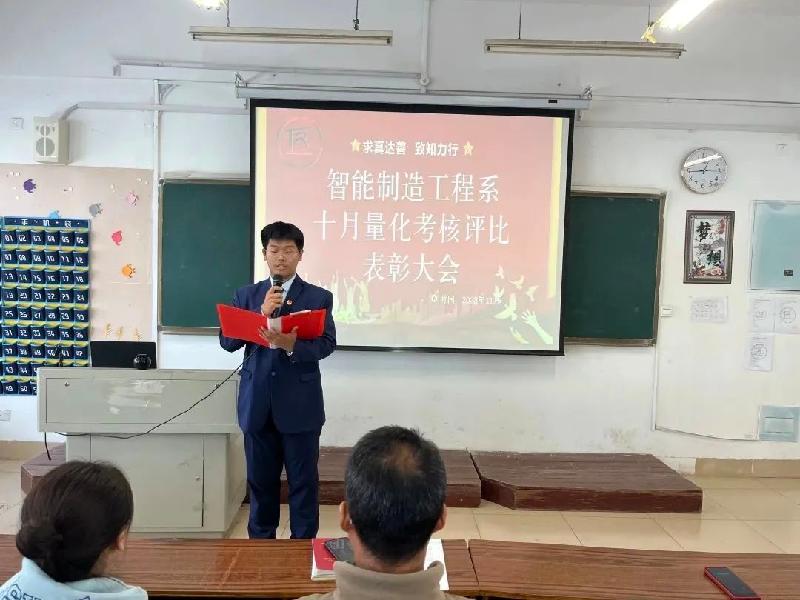 为表彰先进典型,发挥榜样示范引领作用,充分调动全班同学参与班级管理工作的积极性、主动性和创造性,使班级管理逐步趋于制度化、规范化、科学化,进而不断提高学生的整体素质。通过检查、评比,掀起一个“比、学、赶、帮、超”的热潮。根据学院印发的《山东电子职业技术学院学风建设行动方案》,结合我系实际,11月10日中午在3217教室举办“智能制造工程系10月份班级及团支部量化考核总结表彰大会”。党总支副书记岳卫华、全体辅导员、班主任代表及22、23级学生代表参加大会。